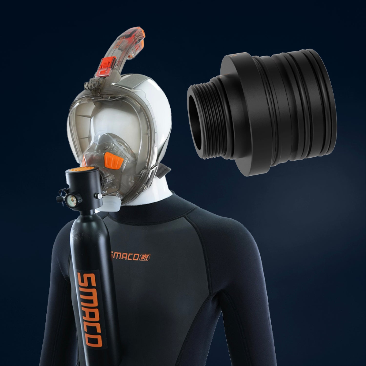 Tank connector allows seamless attachment of a SMACO .5L or .7L mini scuba tank. Ideal for shallow diving sessions up to 10–20 minutes—no separate regulator or mouthpiece required.