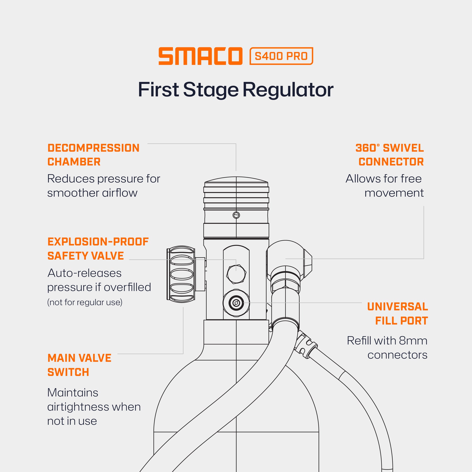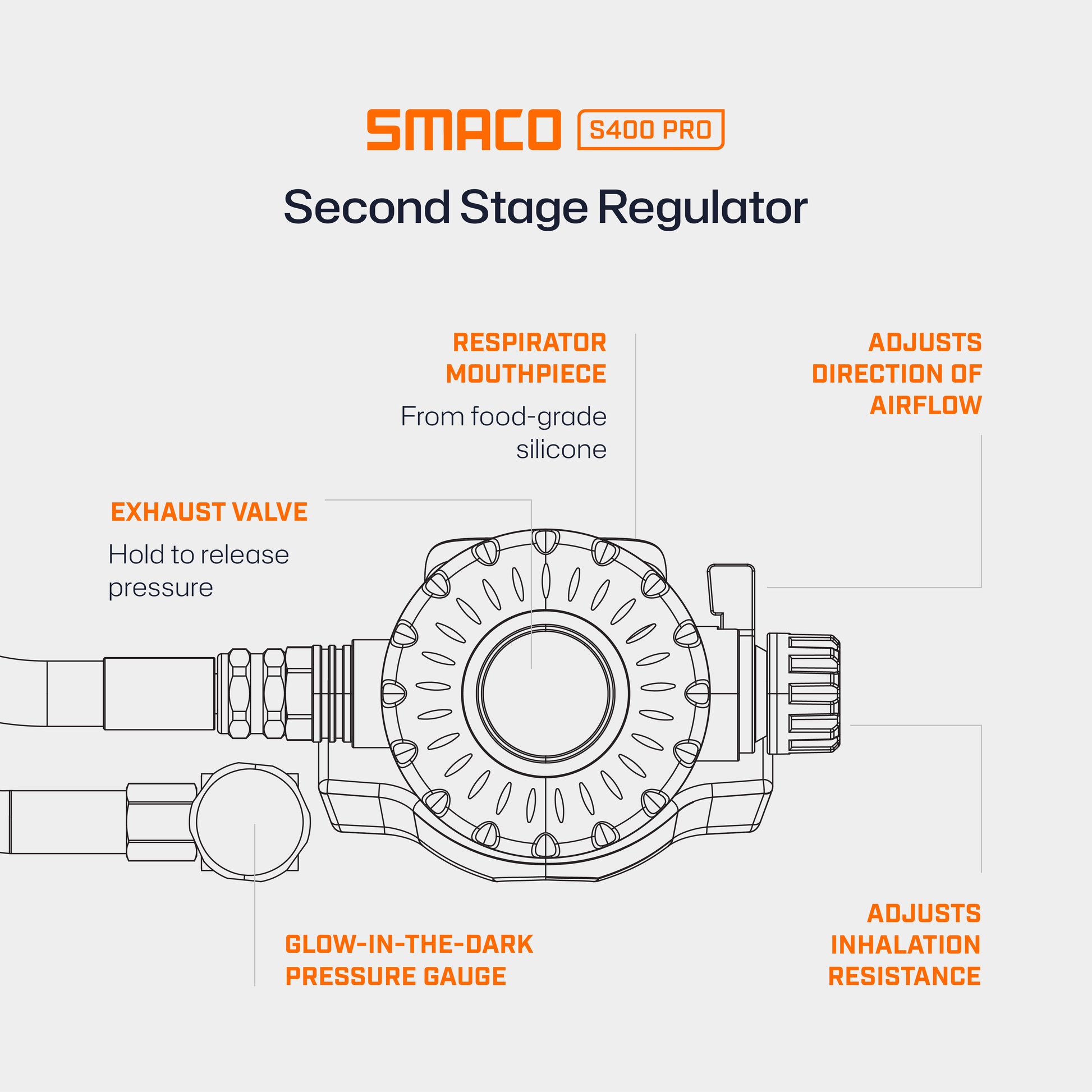 The S400 Plus delivers reliable constant-pressure breathing in a compact 1.0L cylinder with an extension hose pressure gauge, making it easier to check your air supply without disrupting your dive. Lightweight, portable, and built from aerospace-grade aluminum, the S400 Plus is a go-to choice for recreational divers.