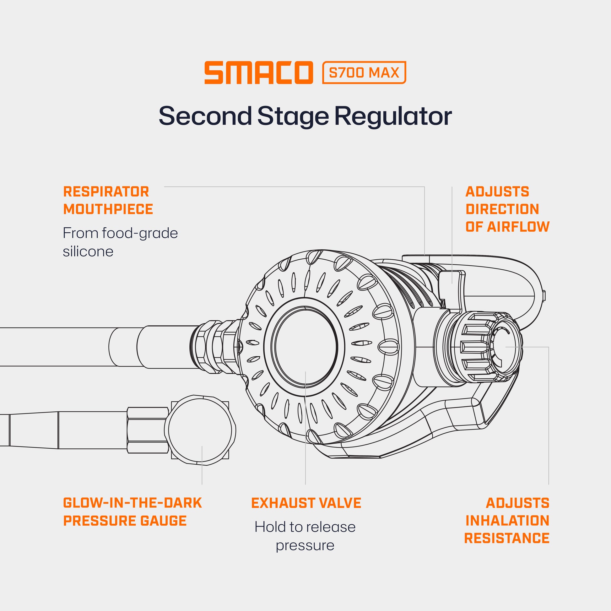 Features adjustable inhalation resistance, an airflow direction switch to prevent free-flow, and an exhaust valve for controlled pressure release—ensuring smoother, more natural breathing underwater.